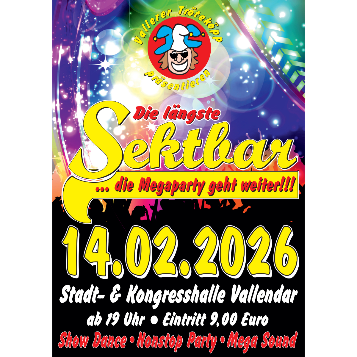 Seit 2000 sind die Vallerer Tröteköpp e.V. Veranstalter „Der längsten Sektbar im Rheinland!?!“ DEM Karnevalssamstagsball für Vallendar und die Region.